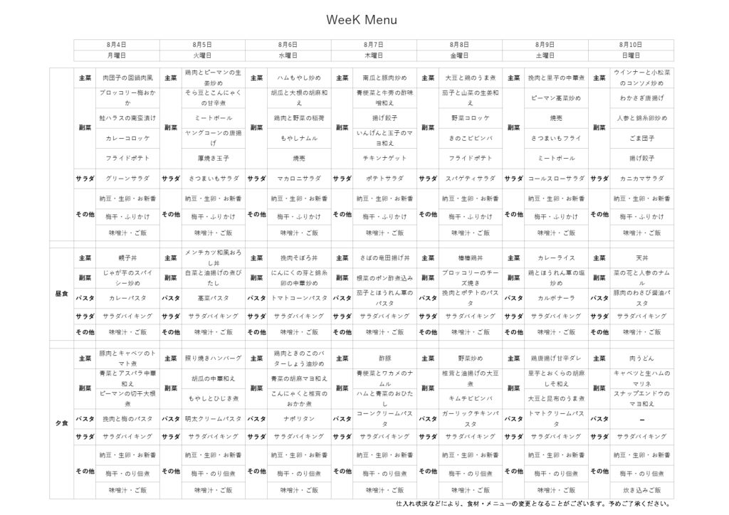 8/4-8/10 ↑料理メニューをクリックすると、別ファイルでご覧いただけます。 不定期の更新となります。これからもメニューや料理写真などご報告させていただきます。 . . . 先週の食事 8/1 豚焼肉丼・里芋の甘辛揚げ・ベーコンとしその和風パスタ・サラダ・味噌汁