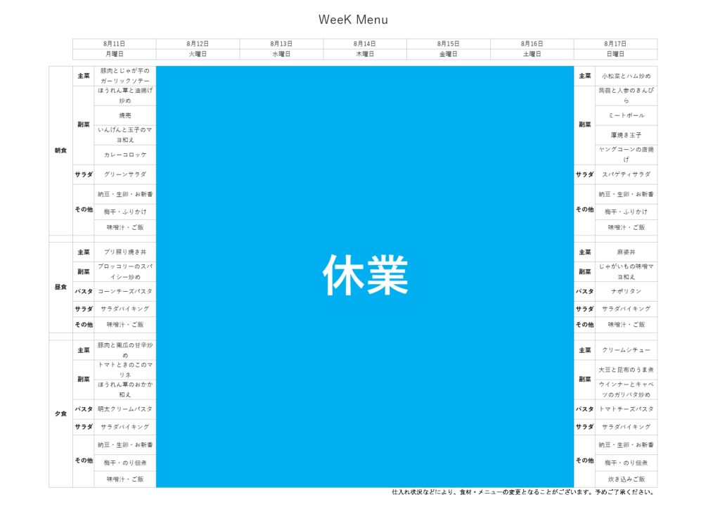 8/11-8/17 ↑料理メニューをクリックすると、別ファイルでご覧いただけます。 不定期の更新となります。これからもメニューや料理写真などご報告させていただきます。 . . . 先週の食事 8/10 天丼・菜の花と人参のナムル・豚肉のわさび醤油パスタ・サラダ・味噌汁