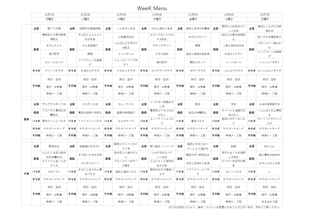 12/1-12/7 ↑料理メニューをクリックすると、別ファイルでご覧いただけます。 不定期の更新となります。これからもメニューや料理写真などご報告させていただきます。 . . . 先週の食事 11/25 鶏肉と蒟蒻の味噌ダレ炒め・オクラと豆腐のおかか和え・青梗菜のナムル・鮭クリームパスタ・サラダ・味噌汁