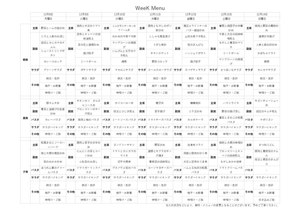 12/8-12/14 ↑料理メニューをクリックすると、別ファイルでご覧いただけます。 不定期の更新となります。これからもメニューや料理写真などご報告させていただきます。 . . . 先週の食事 12/3 カレーライス・蓮根竜田揚げ・カルボナーラ・サラダ・味噌汁