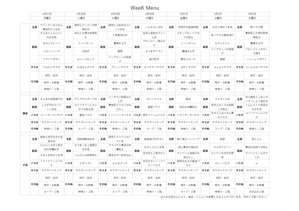 4/27-5/3 ↑料理メニューをクリックすると、別ファイルでご覧いただけます。 不定期の更新となります。これからもメニューや料理写真などご報告させていただきます。 . . . 先週の食事 4/24 豚肉と南瓜の甘辛炒め・いんげんと人参の中華和え・ほうれん草のキムチ和え・きのこのわさび醤油パスタ・サラダ・スープ