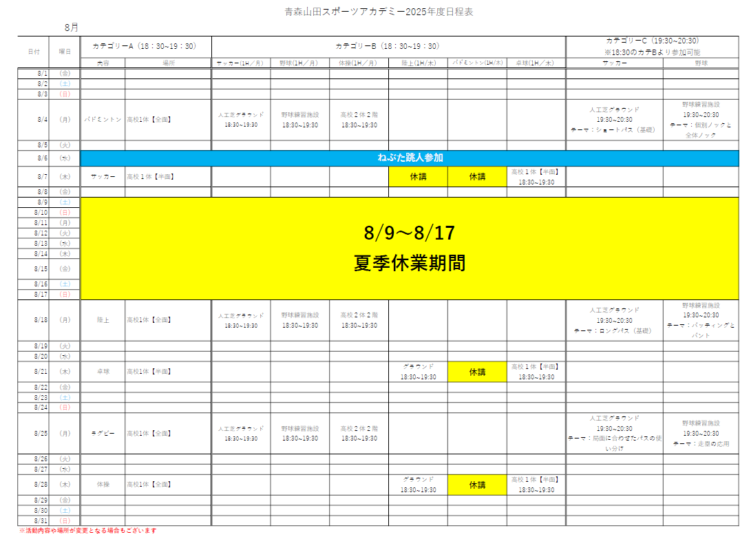 | 活動場所 | 青森山田高校・中学校運動施設 ※競技により場所が異なります |